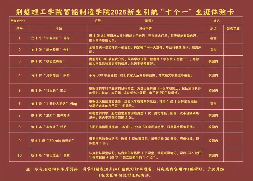 (通讯员:余麒臣 郭紫玲 黄欣怡)为帮助2025级新生科学规划大学生涯、深切体悟学业与生活交织的人生意蕴,近日,太阳集团网tyc9728于文园驿站成功举办“十个一”生涯体验活动,并组织新生以汇报形式分享感悟。
