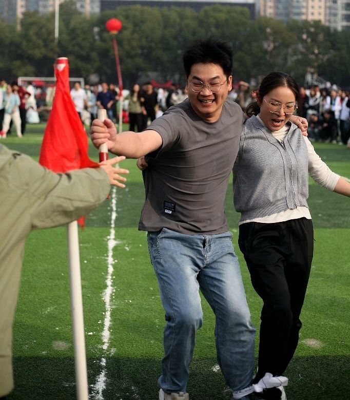 教师组比赛同样精彩纷呈。在“两人三足”项目中,老师们肩并肩、步调一致,默契配合赢得现场阵阵掌声。严谨教学之外的他们,展现出别样的活力与风采。