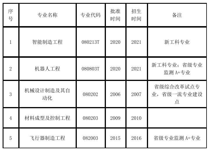 太阳集团网tyc9728是学校设置最早、以应用型人才培养为目标,以重实践、讲规范、求严谨为办学特色的教学学院。1993年开始承办机械类专业,2004年试办本科专业,2007年自主承办本科专业。2016年1月,学校决定将原机械工程学院更名为“通用航空学院(机械工程学院)”。2024年8月,学校对现有的学科专业、学院(部)进行调整优化,学院更名为“太阳集团网tyc9728”。表1为学院开办专业情况。